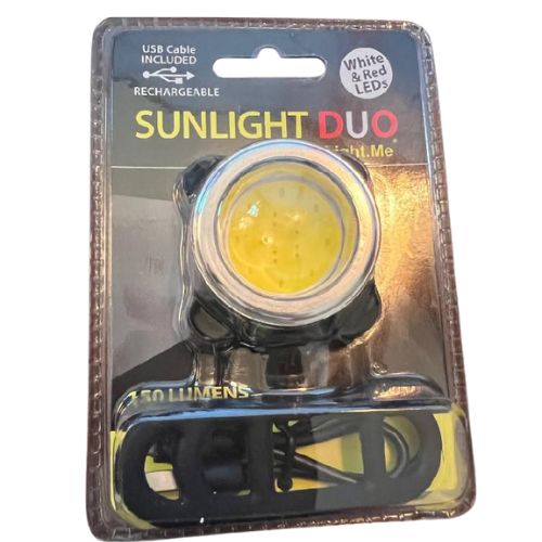 Sunlight Duo’s super-bright, high-energy LEDs blast 150 lumens of light. Red and white LEDs with 5 light modes: 100% red, 100% white, flashing white, white SOS, and super flash red and red. The perfect clip keeps the light centered for hands-free work and fun and includes a super-strong clip and USB Cable